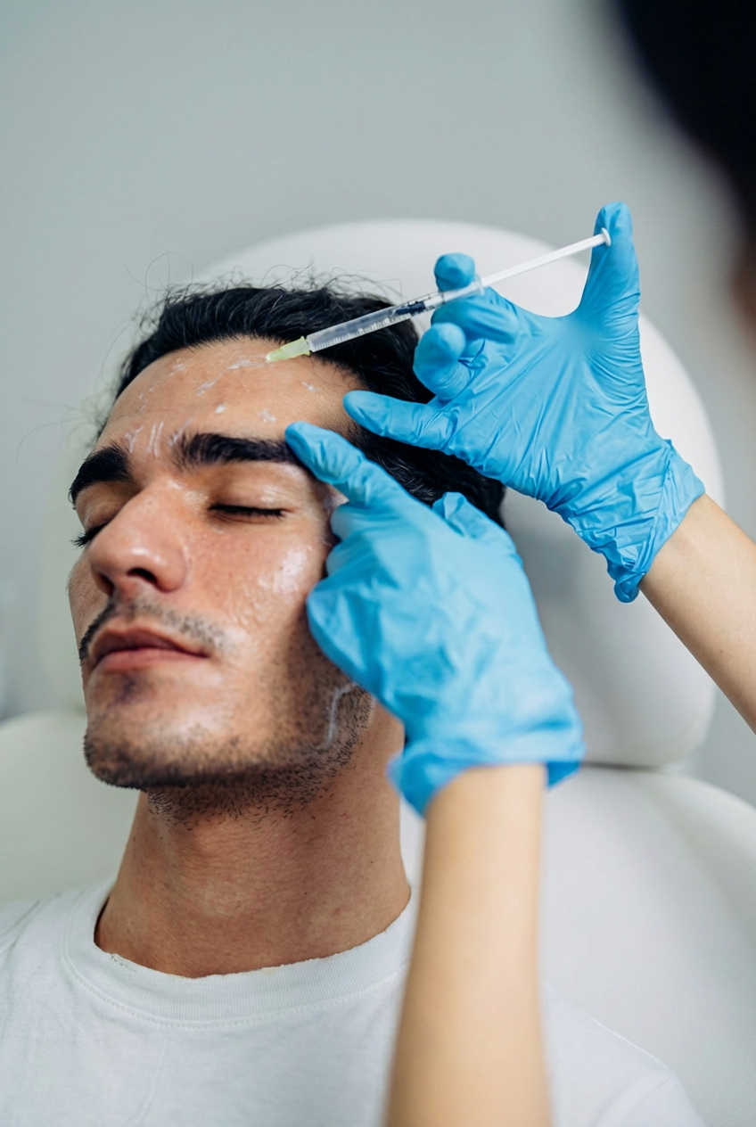 Botox injections by men to reduce facial wrinkles and lines, aiming for a more youthful appearance.