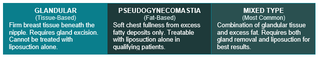 The primary indicator is the presence of firm, disc-like tissue directly beneath the nipple — this is glandular gynecomastia. Soft, generalized chest fullness is more likely fat-based pseudogynecomastia. The most accurate assessment comes from Dr. Day’s in-office examination. The distinction matters because the two conditions require different surgical approaches.